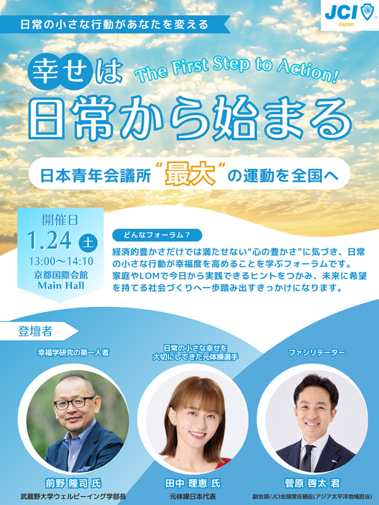 京都会議国家フォーラムは、日本JCが掲げる「幸せな未来へ」という全国運動の起点として開催されます。