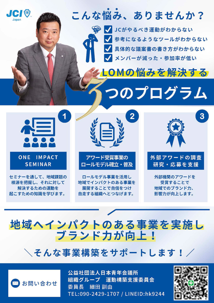 フォーラムやセミナー等に積極的に参加することにより、JC活動に対する理解と学びを深め、私達がどんな影響を与えられるかを考える機会を通じて、日々の活動に活かしていくこと。 - LOMの結束力向上